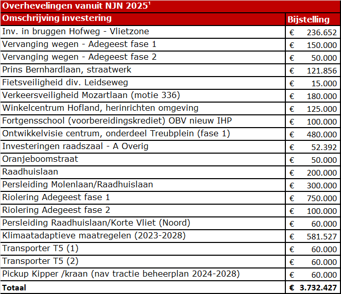 In de Kadernota 2026 toonden we naast de geplande investeringen (bestaand beleid) voor 2026-2029, ook een aantal wensinvesteringen. Dit waren investeringen waar nog geen besluitvorming aan ten grondslag lag. Enkele wensinvesteringen zijn inmiddels besloten en hierdoor stijgt het investeringsvolume in de jaren 2026 tot en met 2028 met € 2.526.000. Hiervan heeft € 1.106.000 betrekking op het jaar 2026.